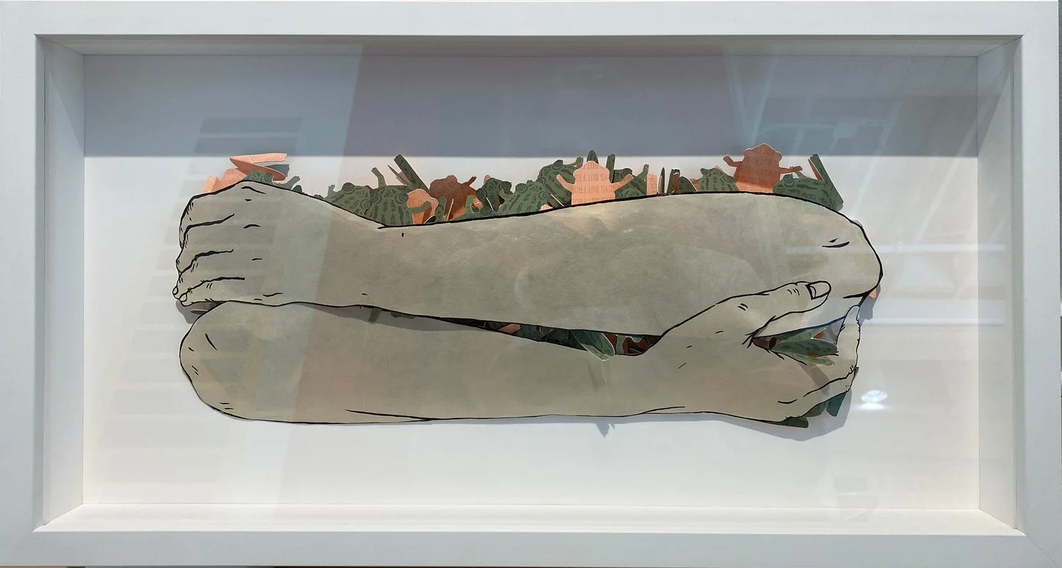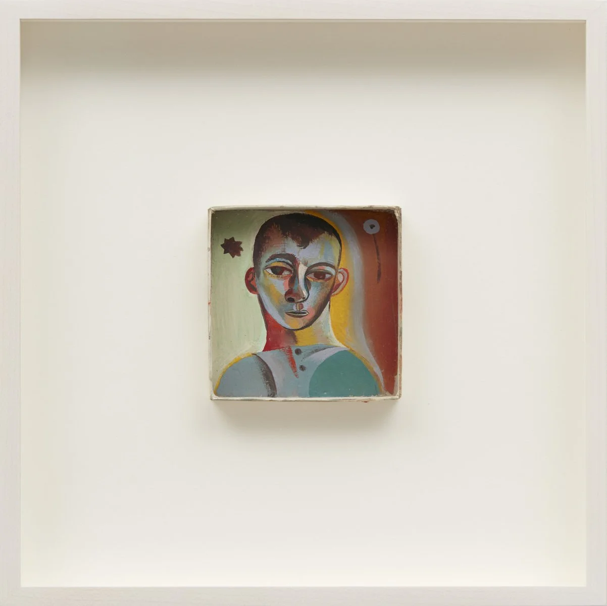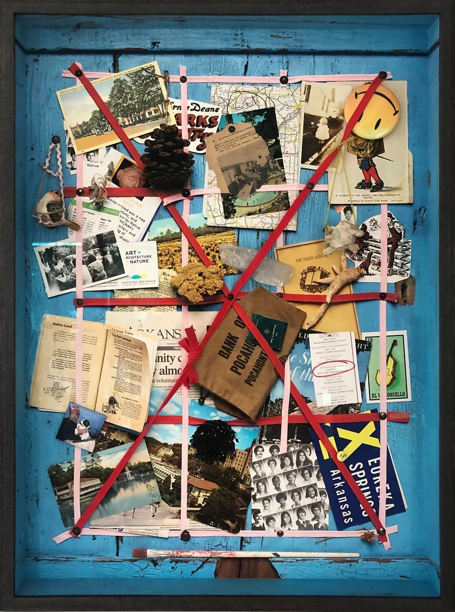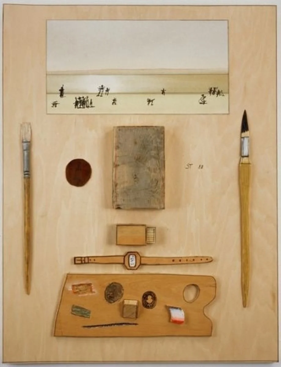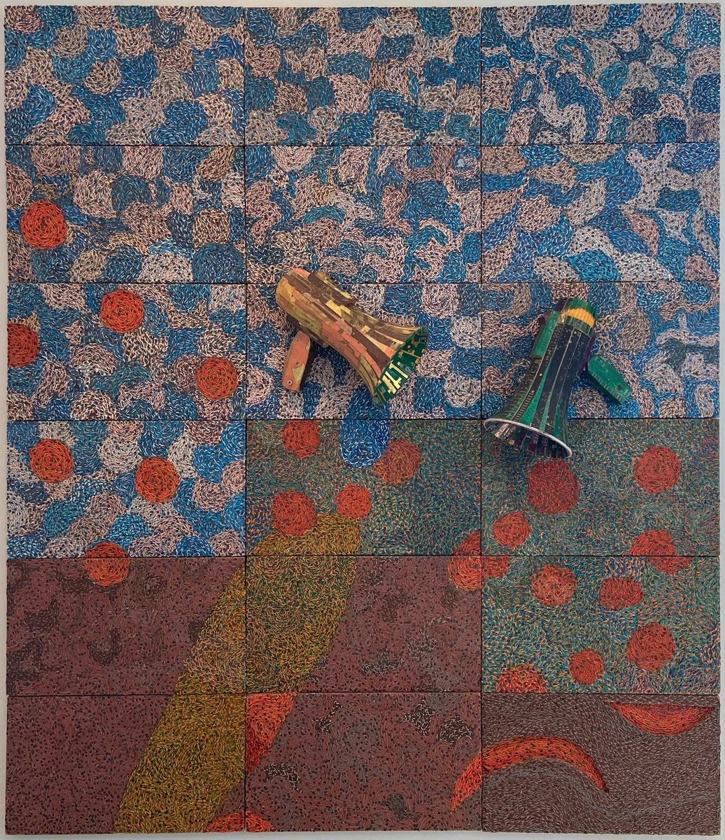 Carved wood, ink, colored pencil, graphite, crayon, and watercolor on paper, and a handmade penny on wood panel