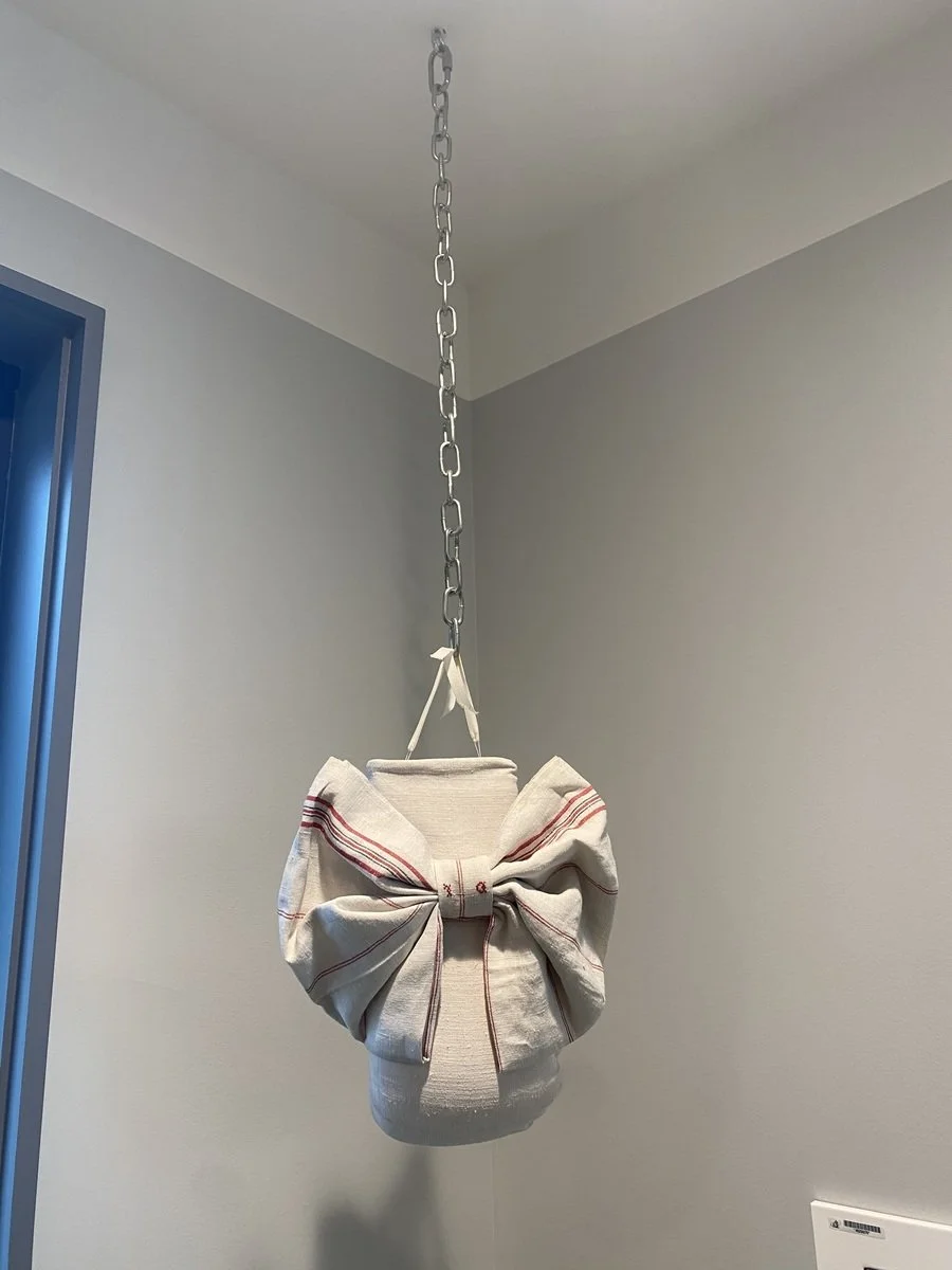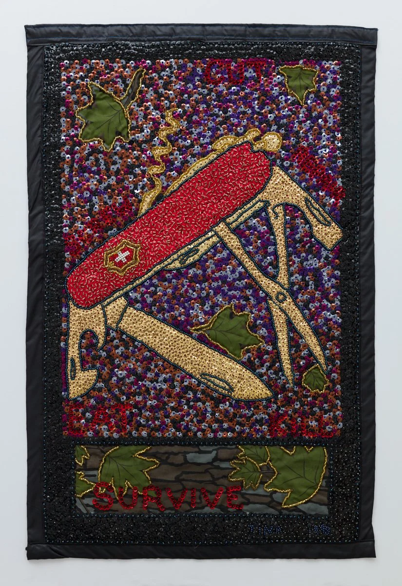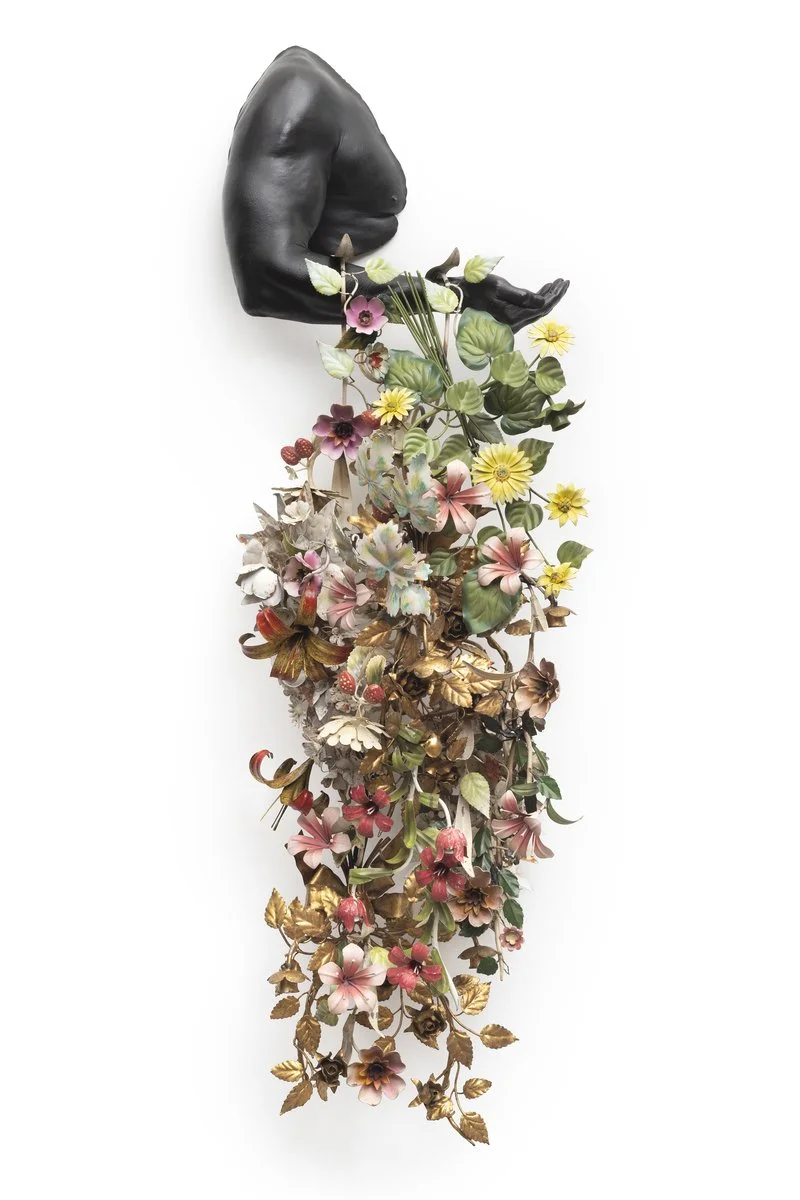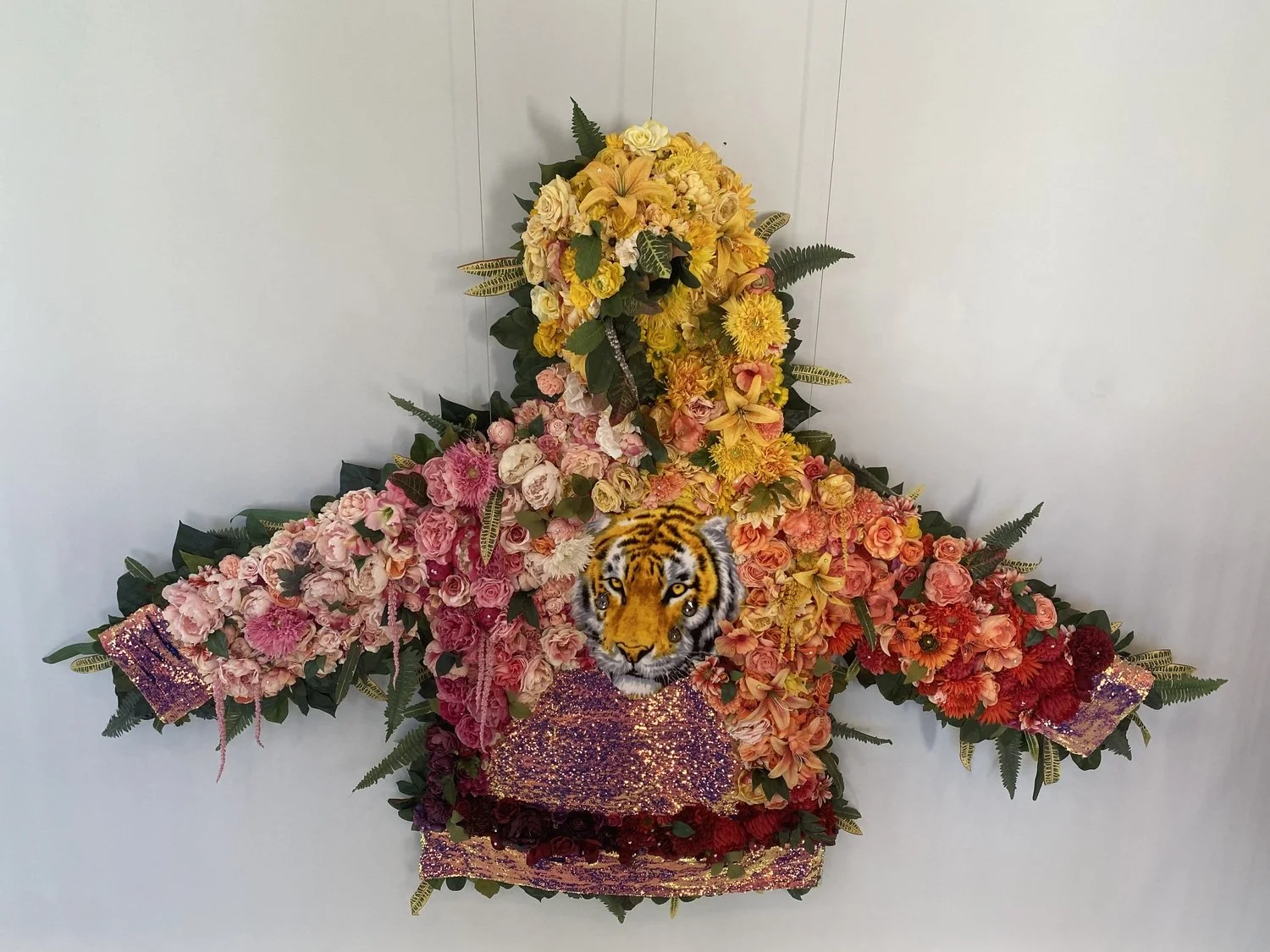 Silk flowers, rhinestones, and beads on fabric with steel frame