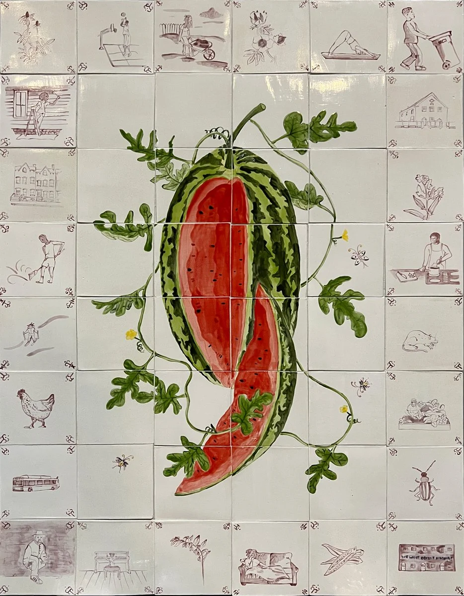 Metallic Lambda on 3mm dibond, wood sprayed white gloss and Aicha Tomato cans